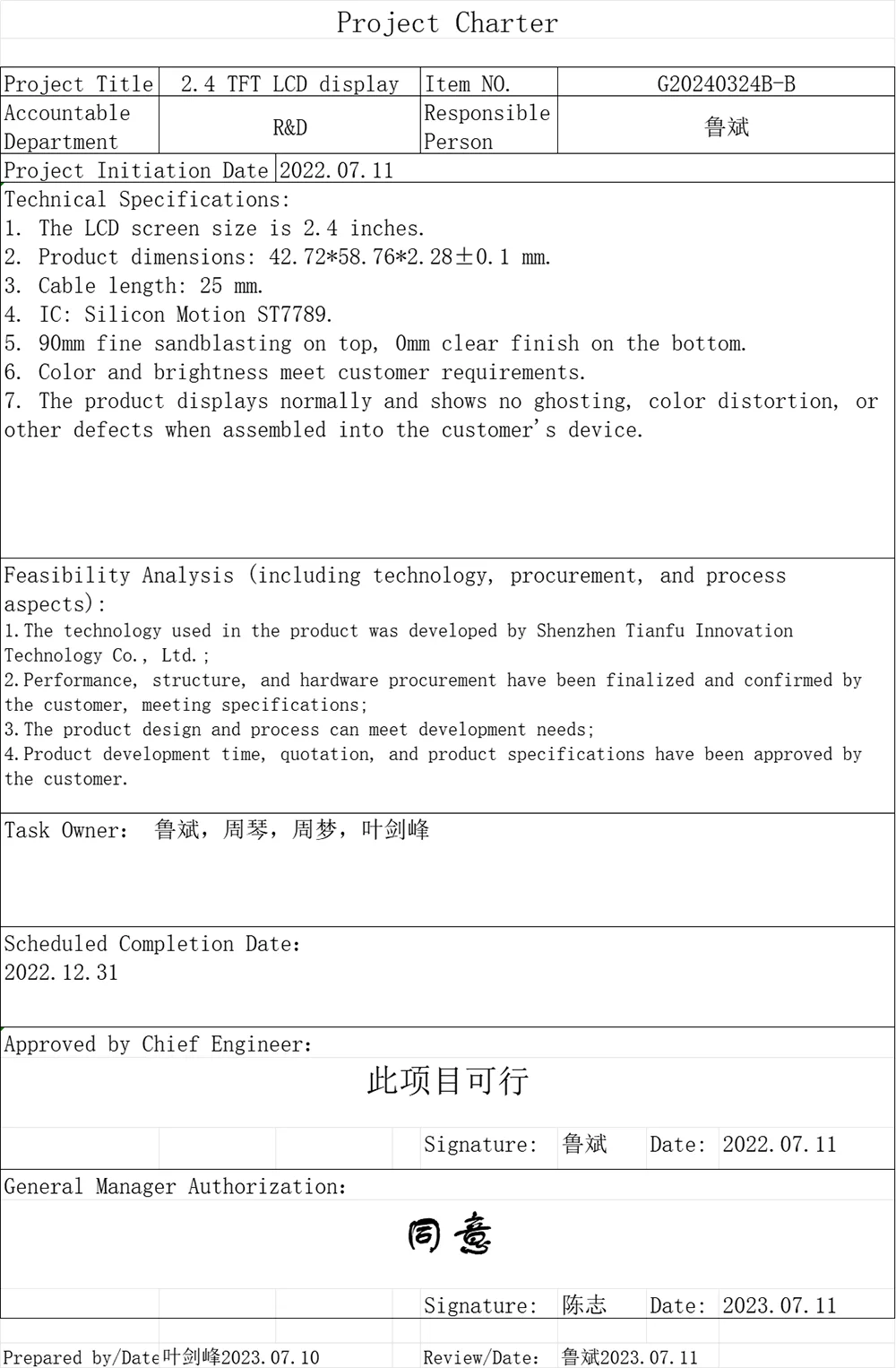 ในฐานะซัพพลายเออร์และผู้ผลิต LCD ที่มีมายาวนานในประเทศจีน TF ให้ความสำคัญกับการผลิตผลิตภัณฑ์คุณภาพสูงมาโดยตลอด โมดูลหน้าจอ TFT LCD อุณหภูมิกว้าง 2.4 นิ้ว เข้ากันได้กับไมโครคอนโทรลเลอร์กระแสหลัก ให้ความสว่างทั่วไป 280–300 cd/m² และอัตราส่วนคอนทราสต์ 200:1