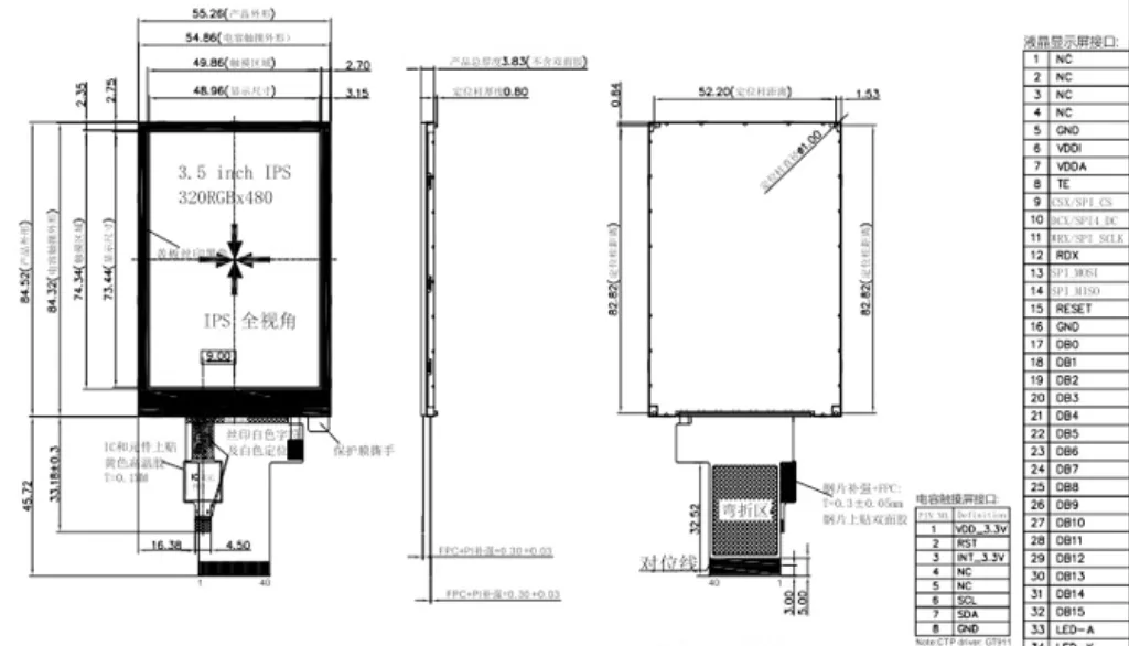 3.5 นิ้ว RGB 320x480 IPS TFT โมดูลหน้าจอสัมผัส TFT ขนาดเล็กรองรับ MCU อินเทอร์เฟซแบบขนาน 8/16 บิตที่ยืดหยุ่น ขนาด 55.26 × 84.52 × 2.40 มม. (ไม่รวม FPC/กาว) และพื้นที่ใช้งาน 48.96 × 73.44 มม. เหมาะกับพื้นที่แคบ นอกจากนี้ยังมีช่วงอุณหภูมิในการทำงาน -10°C ถึง +60°C (ช่วงอุณหภูมิในการจัดเก็บ -20°C ถึง +70°C) ทำให้มั่นใจได้ถึงประสิทธิภาพการสัมผัสที่มั่นคง